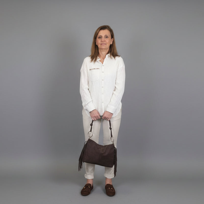 Camicia con effetto stropicciato, elasticizzata, dal taglio classico ma dalla linea asciutta, taschina con perline.