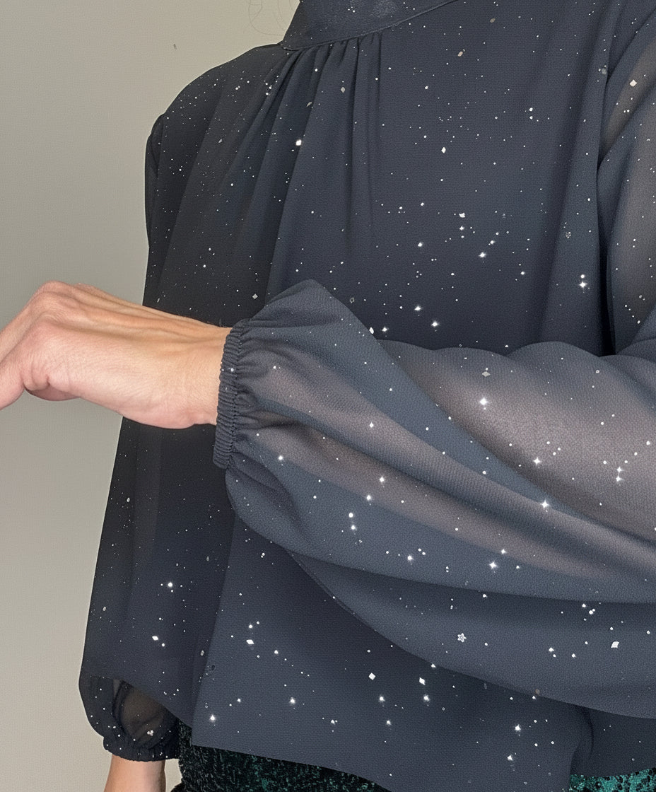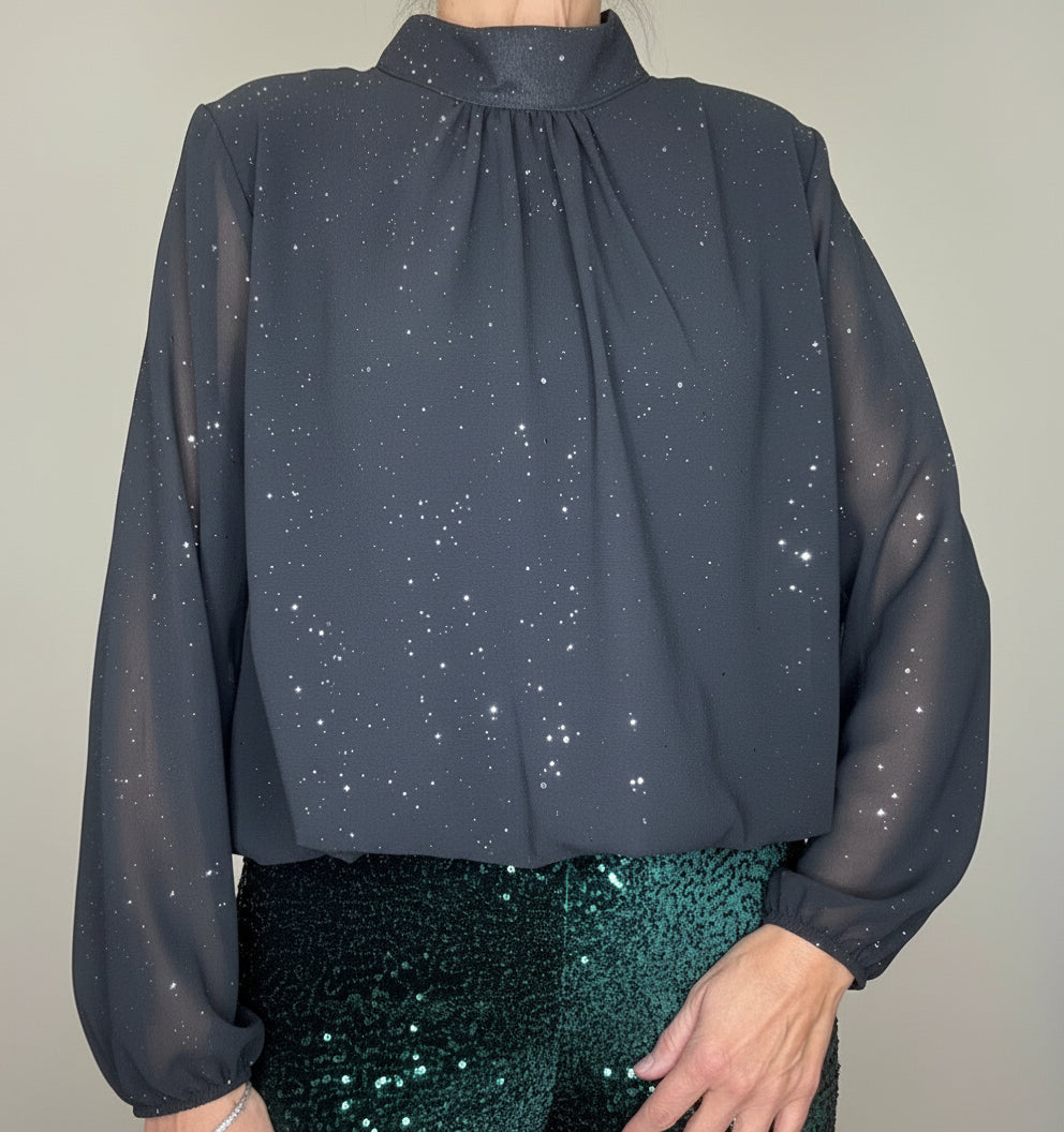 Camicia con collo alla coreana, fondo a palloncino, chiusura con bottone, maniche ampie trasparenti, interno con fodera in viscosa, piccoli punti luce argento.