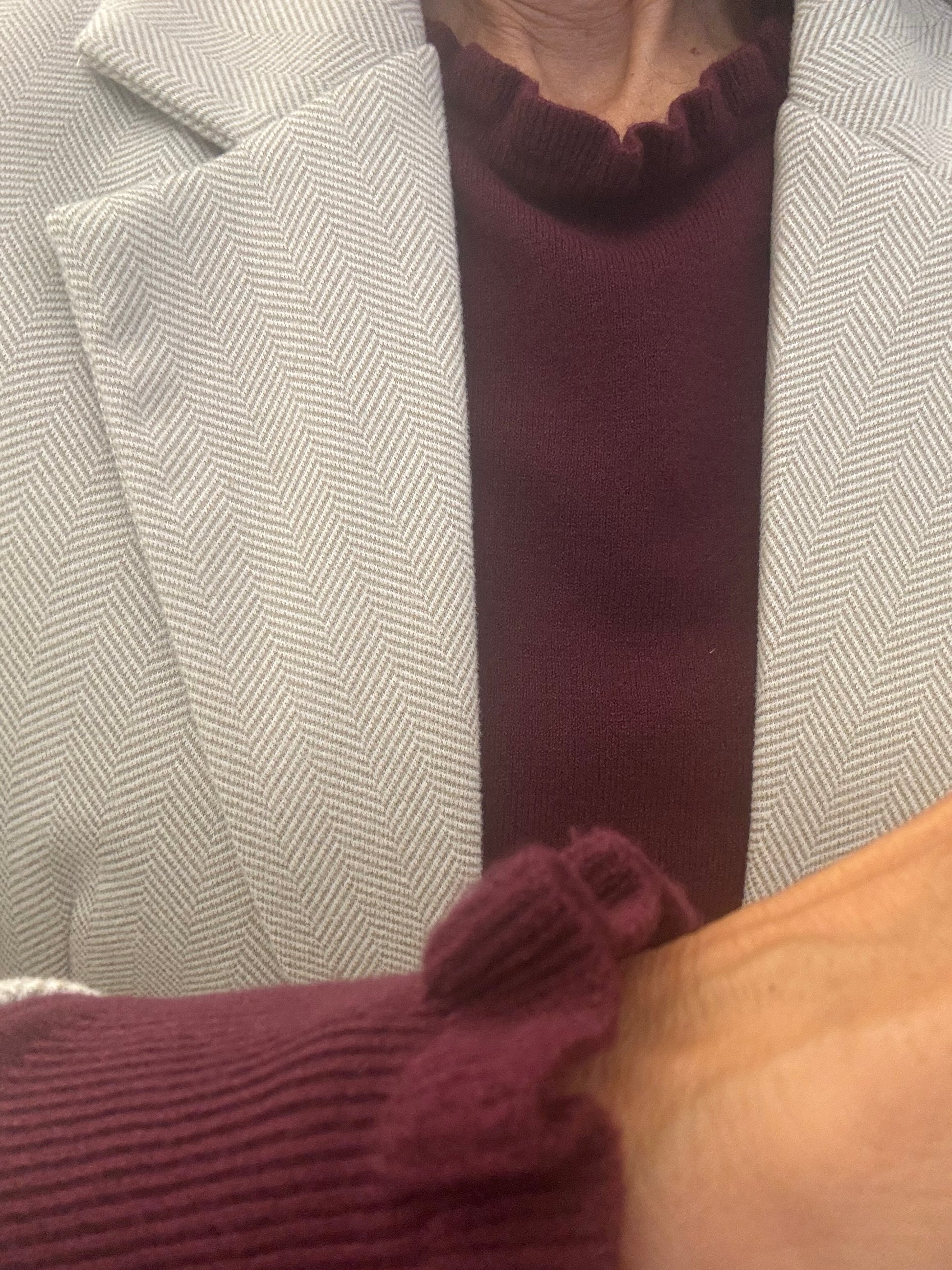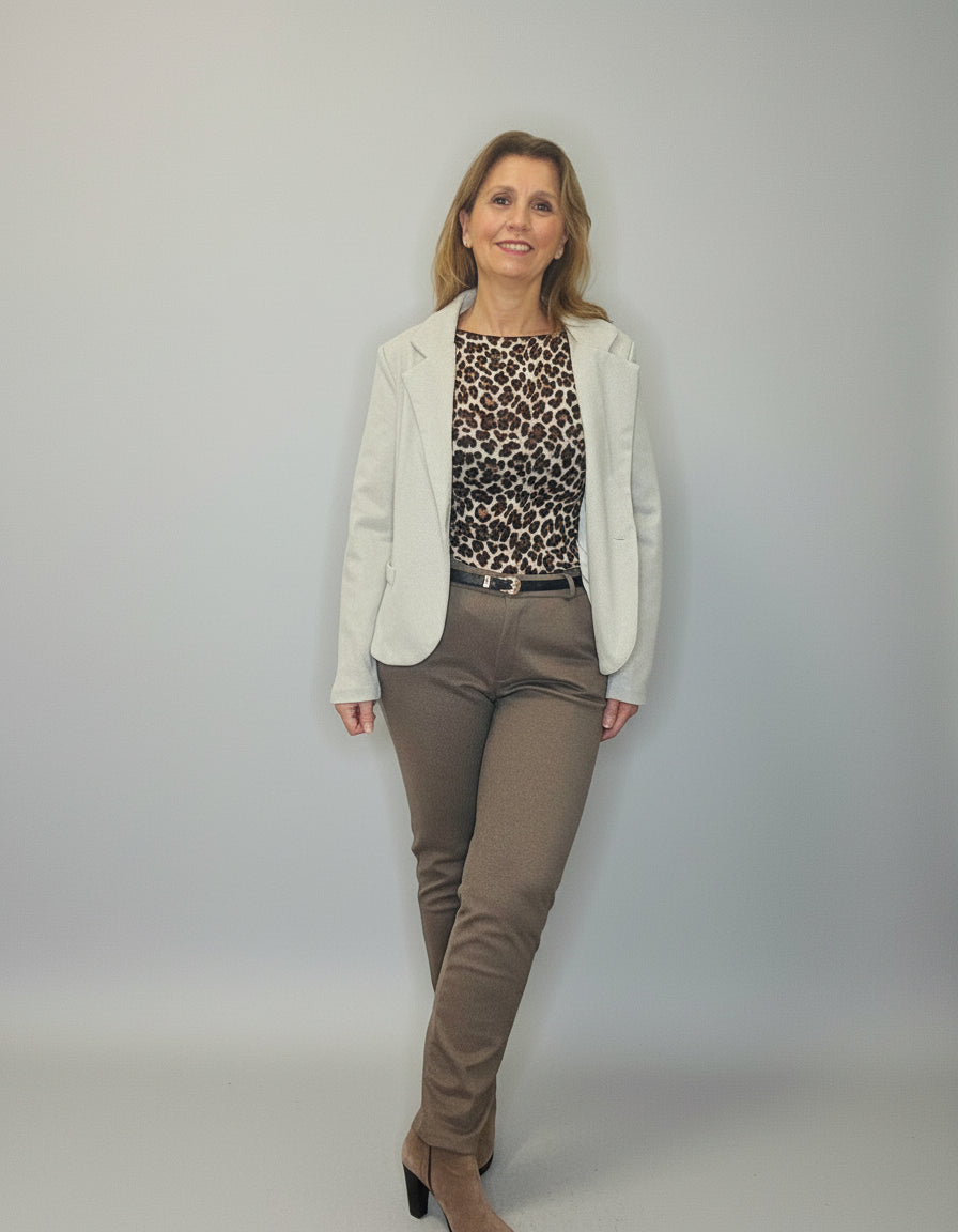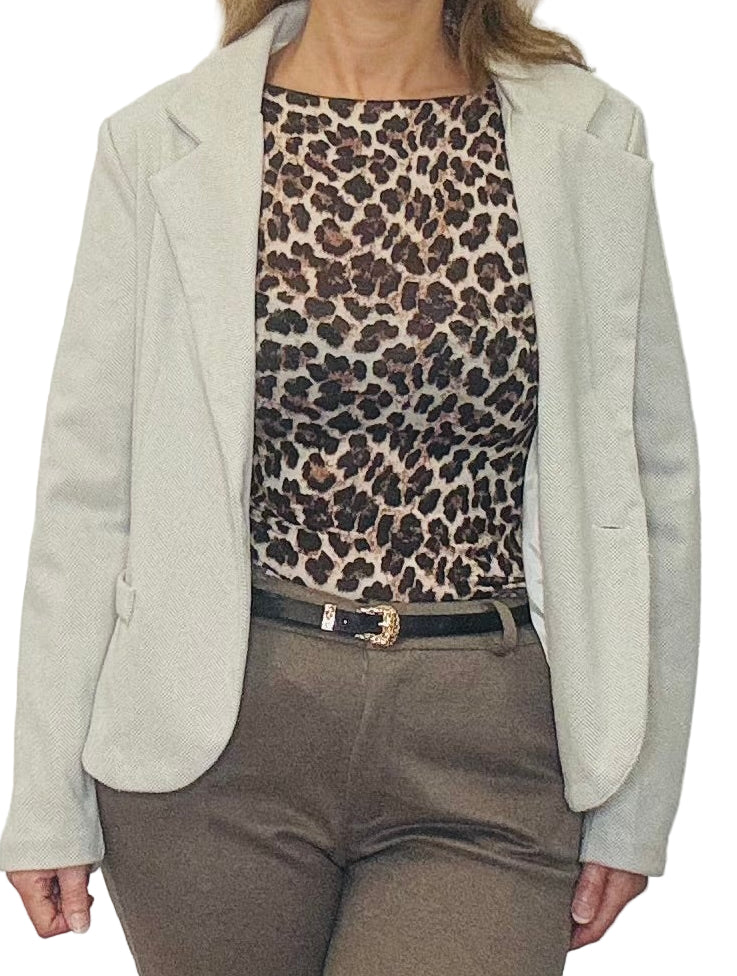 Giacca spinata nei colori burro e nocciola, in panno, chiusura con bottone, tasche finte applicate, collo a reverse, vestibilità asciutta.
