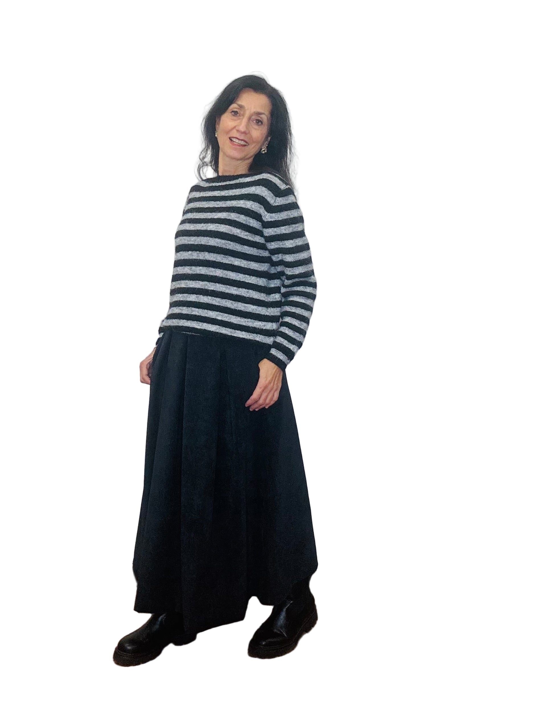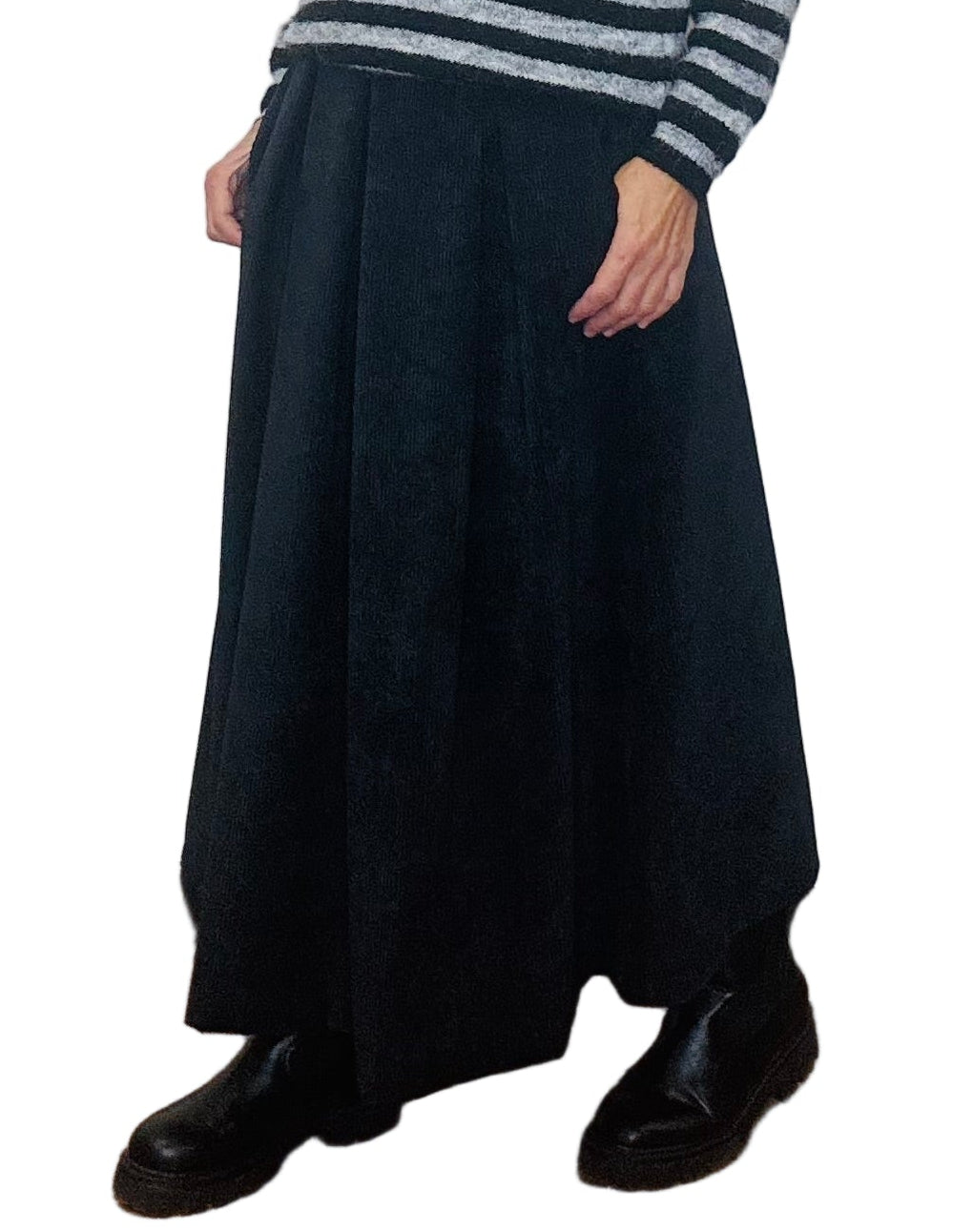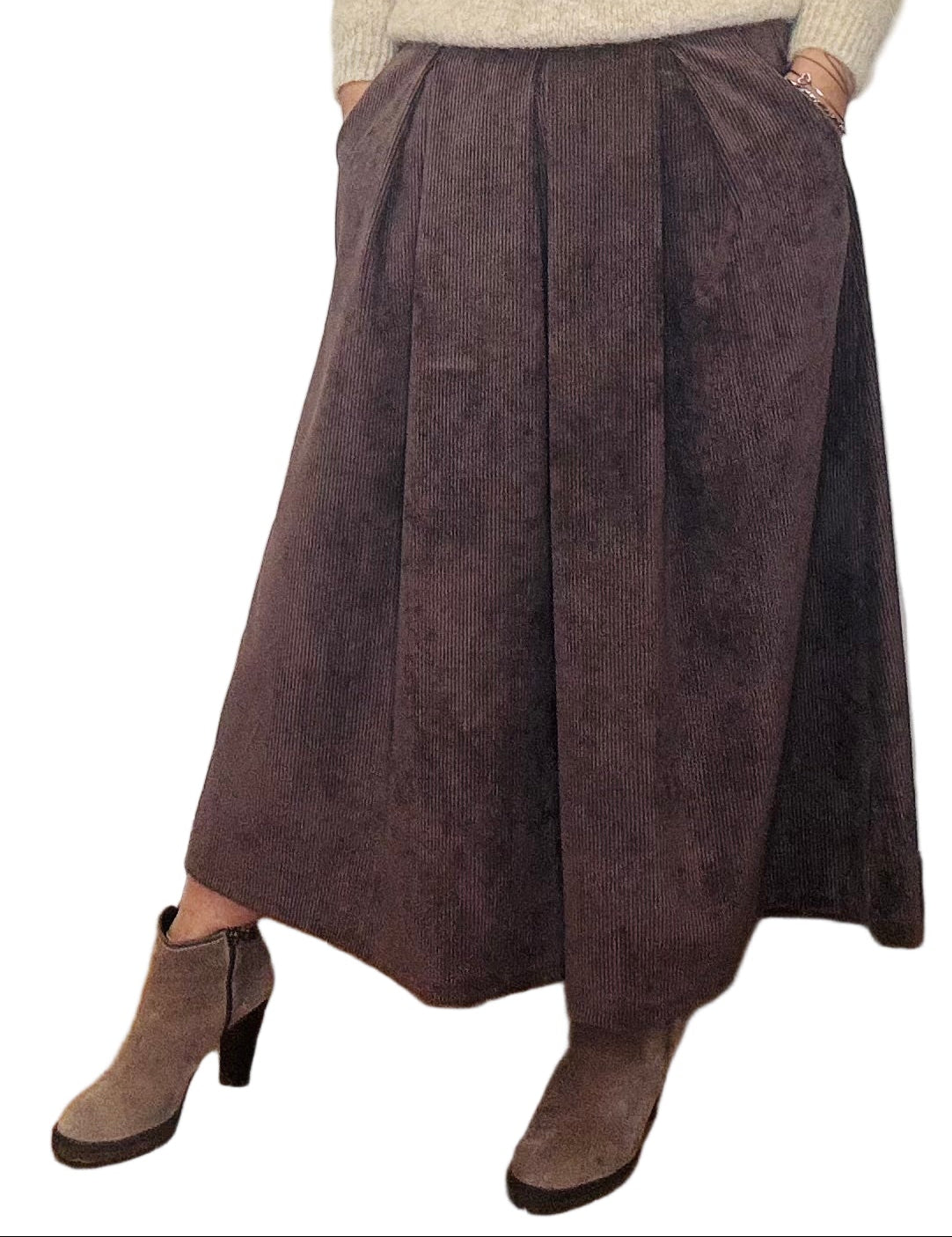 Gonna lunga, ampia, in velluto a coste sottili, elastico in vita, tasche laterali, buona vestibilità.