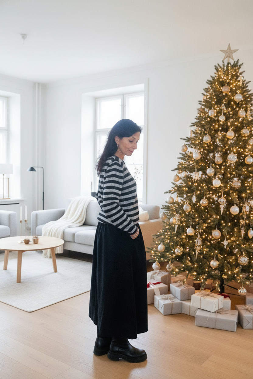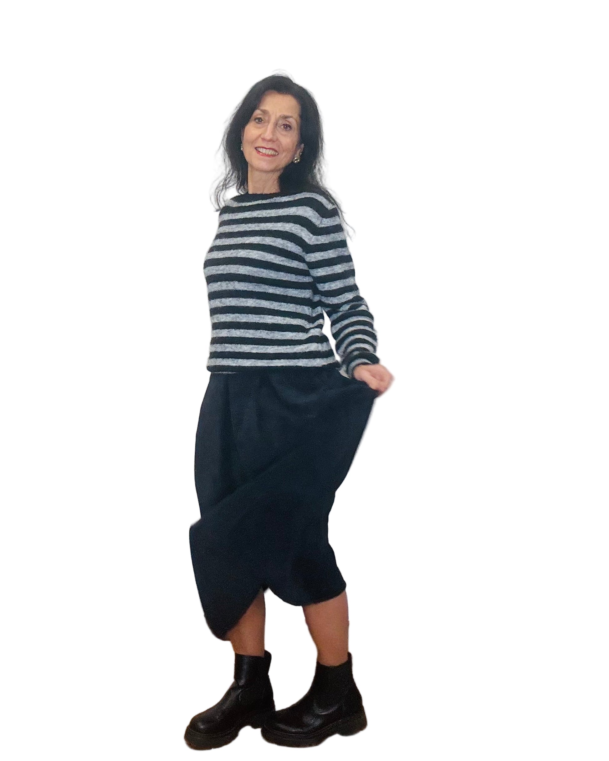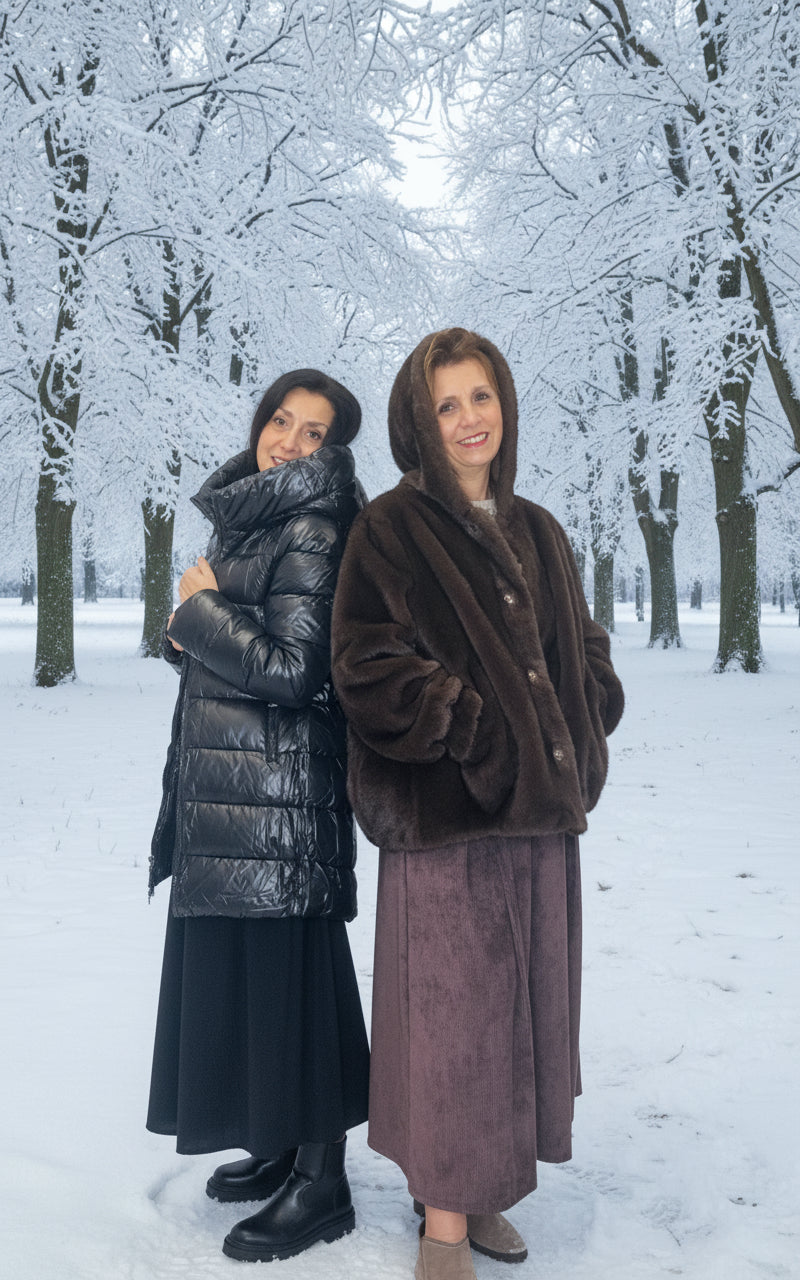 Gonna lunga, ampia, in velluto a coste sottili, elastico in vita, tasche laterali, buona vestibilità.