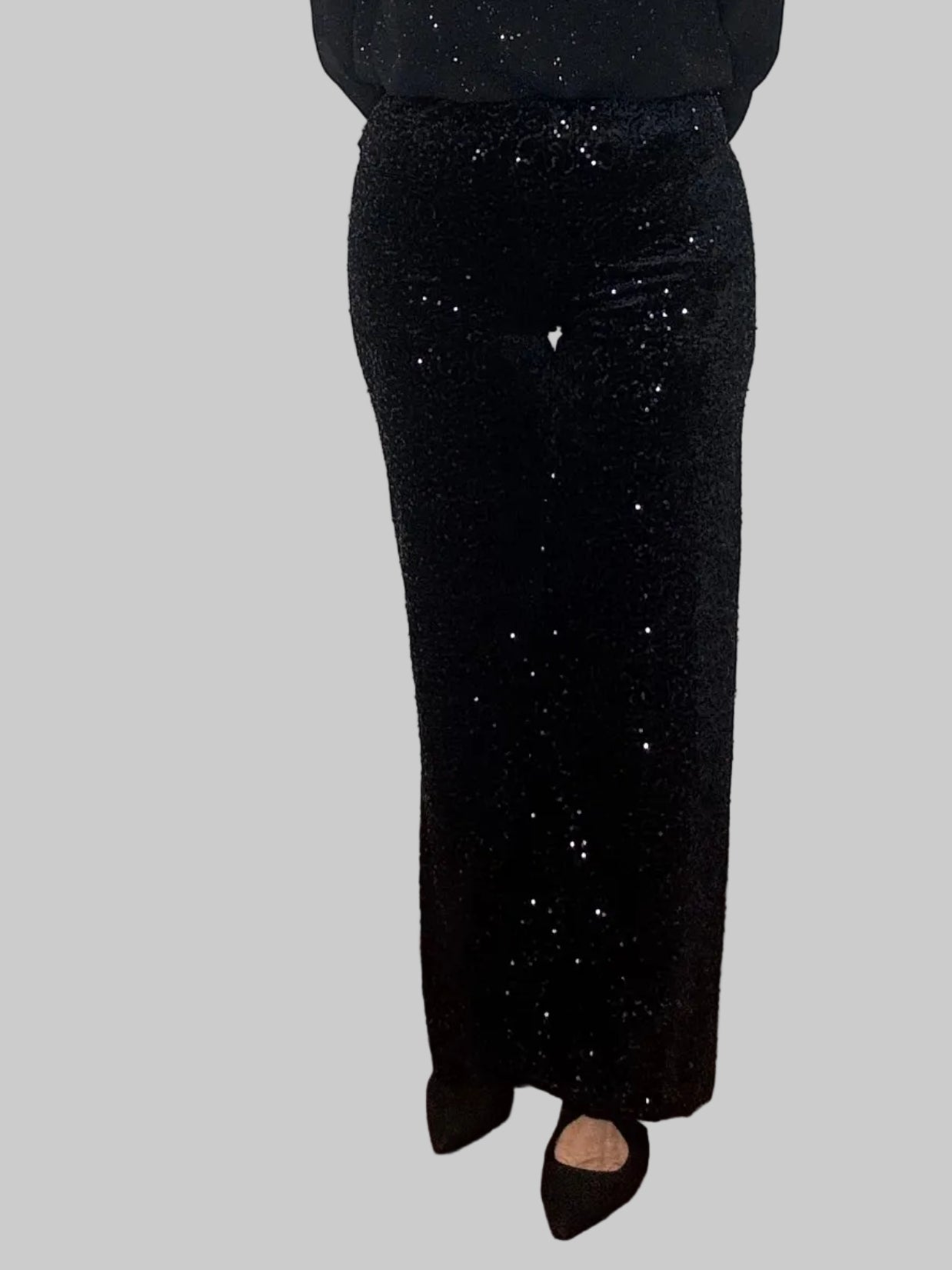 Pantalone elasticizzato in paillettes tono su tono, fondo in vellutino, elastico in vita, interno su tutta la gamba rivestimento in viscosa (così non punge).